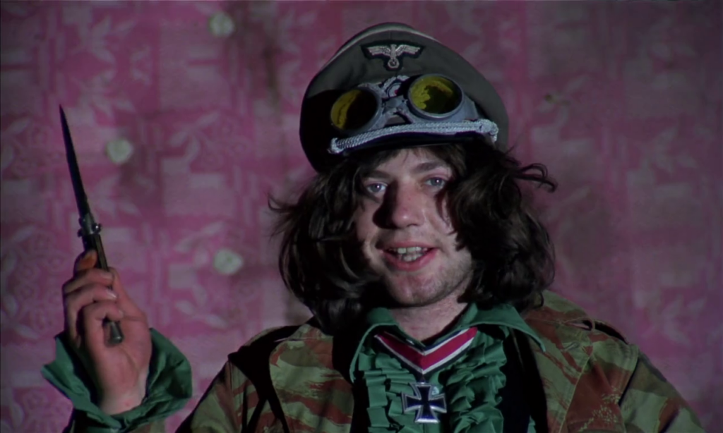 A rival gang they beat up, not coincidentally, are dressed like Nazis – all this recollecting England's glory days during the war. (Note the aristocratic hats in the brainwashing sessions). Alex almost sees himself as someone policing the streets, hence his references to cleanliness when beating up the homeless man and how scruffy the rival gang is.