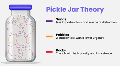 According to Pickle Jar Theory, time is limited, like the volume of a pickle jar. To manage your time effectively, you need to know the level of importance of each activity.