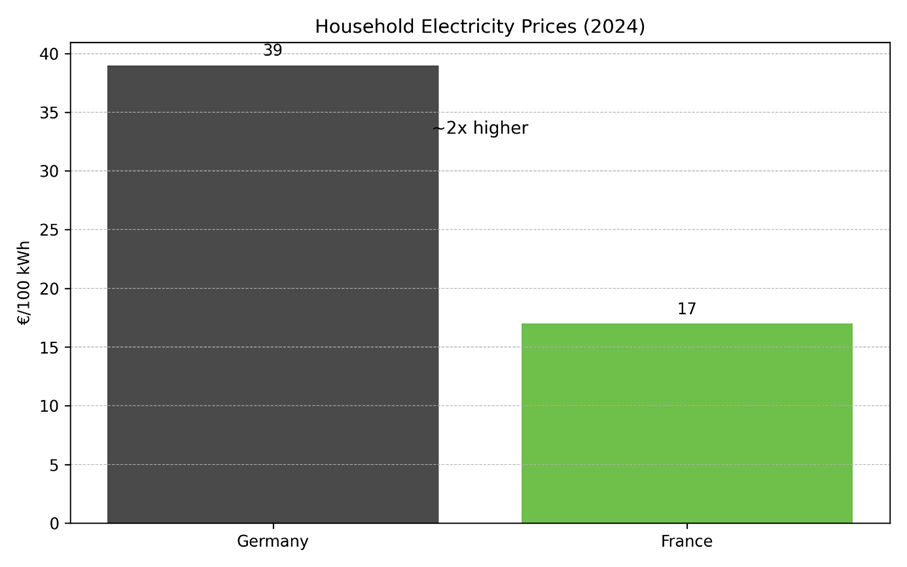 Figure: Electricity prices reflect energy policy: German households pay approximately twice as much as French households. Source: Eurostat (2024).