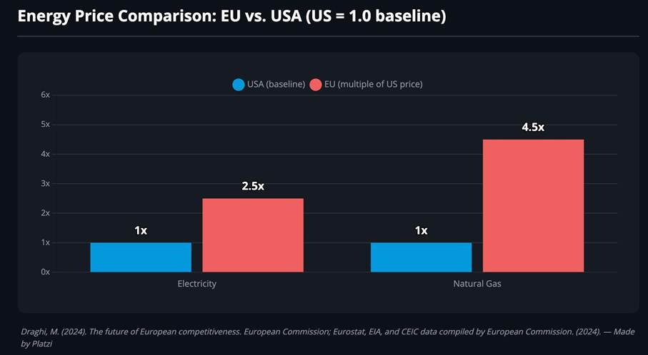 Figure: European energy prices are structurally much higher than in the US, a direct consequence of policy choices. Source: European Commission (Draghi Report, 2024), based on Eurostat, EIA and CEIC data (adaptation).