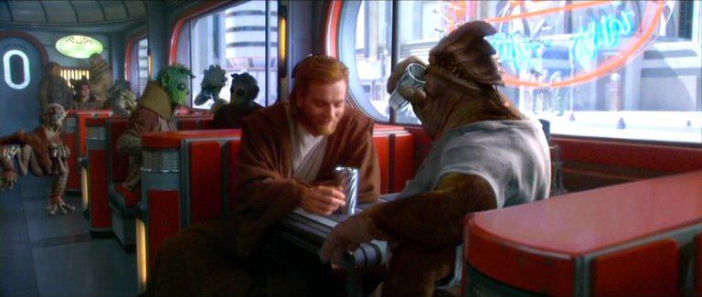 There’s a fast food joint on roller skates here, and it’s referenced in Attack of the Clones, a scene I actually liked, would you believe it? It’s those little details and jibes that make all the difference, making it a lived-in reality that’s colourful, nuanced, and enjoyable.