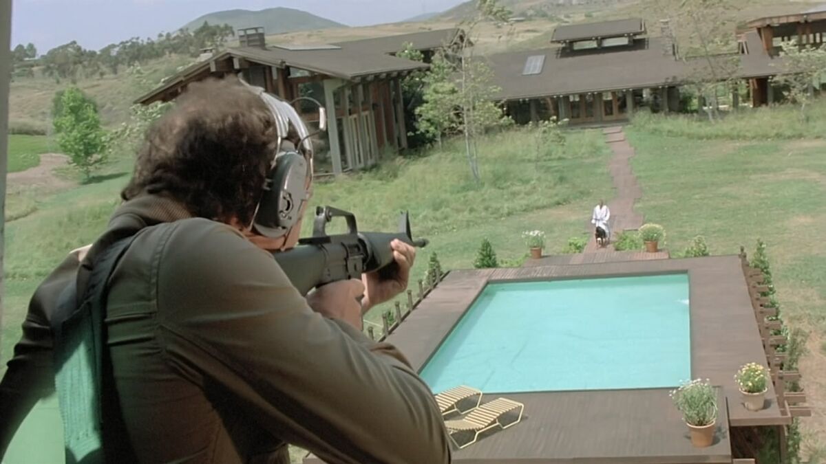All he has to do is shoot at a target with an M-16, firing from a helicopter, he later learns. They never tell him who, but he figures it out when he’s on a practice run. He says no, but they kidnap his wife, and he does the dastardly deed. In fact, he didn’t.