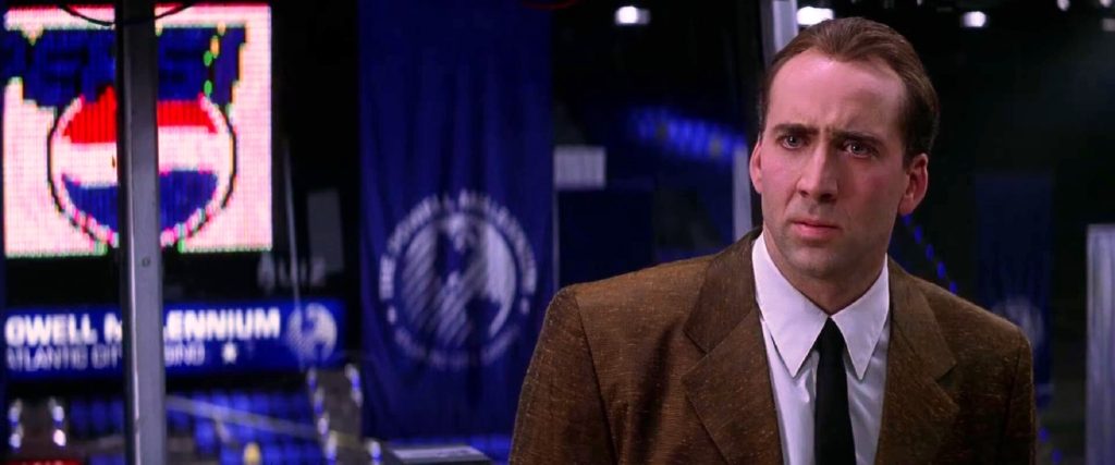 COMMERCIAL CAPERS: Nicholas Cage as the anti-hero hero of the piece. Notice the Pepsi logo over the millennium sign. Brian De Palma's the man!